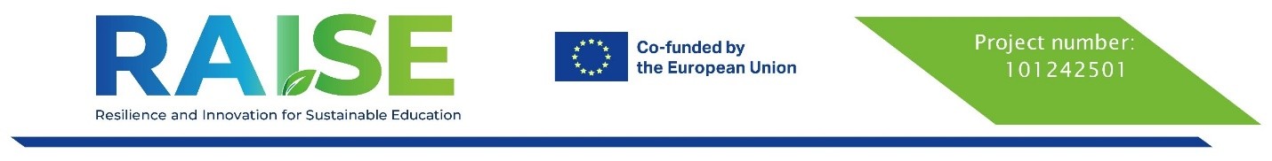 The RAISE (Resilience and Innovation for Sustainable Education) project seeks to empower Vocational Education and Training (VET) centres in a third-country context to become sustainable models of excellence by focusing on educational practices, pedagogical innovation, and the effective management of learning spaces. The project targets two key groups: educators and training managers. It equips them with the competencies and resources needed to drive sustainability in their organisations. Through capacity-building activities, RAISE will support the development of innovative pedagogical approaches, including integrating cutting-edge technologies such as Extended Reality (XR) and Artificial Intelligence (AI) to enhance the teaching and learning experience. Educators will gain access to hands-on methodologies like living labs, fostering active, learner-centred, and experiential practices that promote sustainability. At the same time, the project will focus on transforming learning environments by providing training managers with pedagogical principles to design spaces that are eco-friendly and conducive to collaborative and engaging education. This includes redesigning training spaces with sustainability principles in mind and promoting interactive learning environments that reflect the needs of modern education. A key component of the project is the organisation of staff mobility programmes, allowing educators and training managers to visit leading sustainable VET centres in Europe. These exchanges will enable participants to observe best practices, engage in knowledge sharing, and develop actionable plans to adapt these strategies to their institutions. By the end of the three-year project, RAISE aims to deliver innovative educational resources to VET centres, and upgraded learning environments, all of which will contribute to the green transition in education and support the achievement of global sustainability goals.